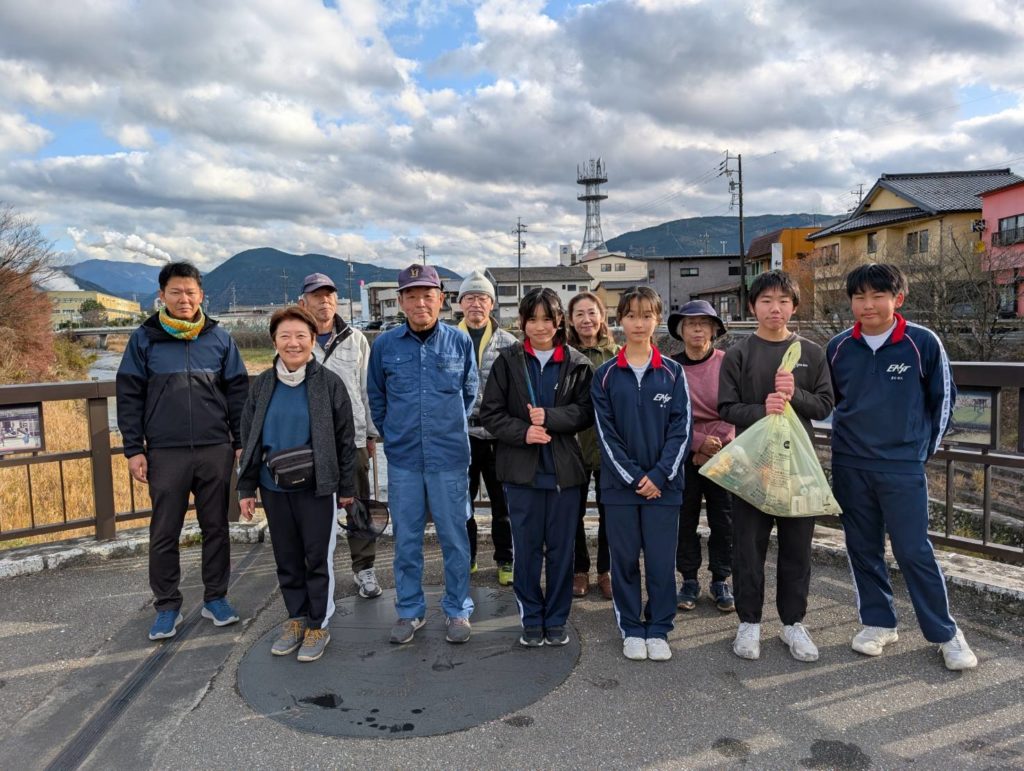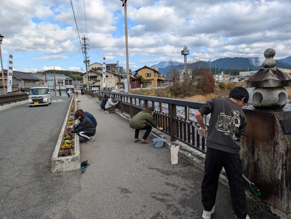 12月13日(土)大井四六姫宿の会主催、大井太鼓振興会協力で中山道大井橋の花壇花植え、欄干清掃、阿木川左岸遊歩道ゴミ拾いを行ないました。