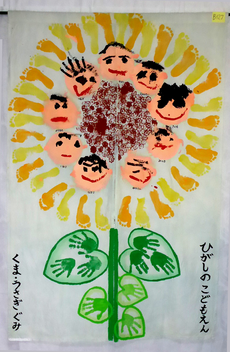 説明 園庭に背の高いひまわりが育ち、「たかいね!」「すごーい!」と大きくなったことを喜びました。そんなひまわりのようにすくすくと大きくなあれ!との思いを込めてみんなでヒマワリの花を作りました。くま・うさぎ組9人の足で花を咲かせ、手で葉っぱを表現しました。また、園で育てた藍の葉で藍染めをして青空を作りました。にっこり笑顔のヒマワリの完成です!♢