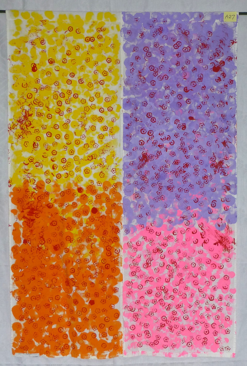 説明 ポンポン スタンプあそびが大好きなひよこぐみの1,2才児さん。のれんの準備をはじめると「ポンポンする~」と机の前で待っていて夢中でポンポン色付けをする子どもたちでした。最後に大きく育ったオクラの花も咲かせました。