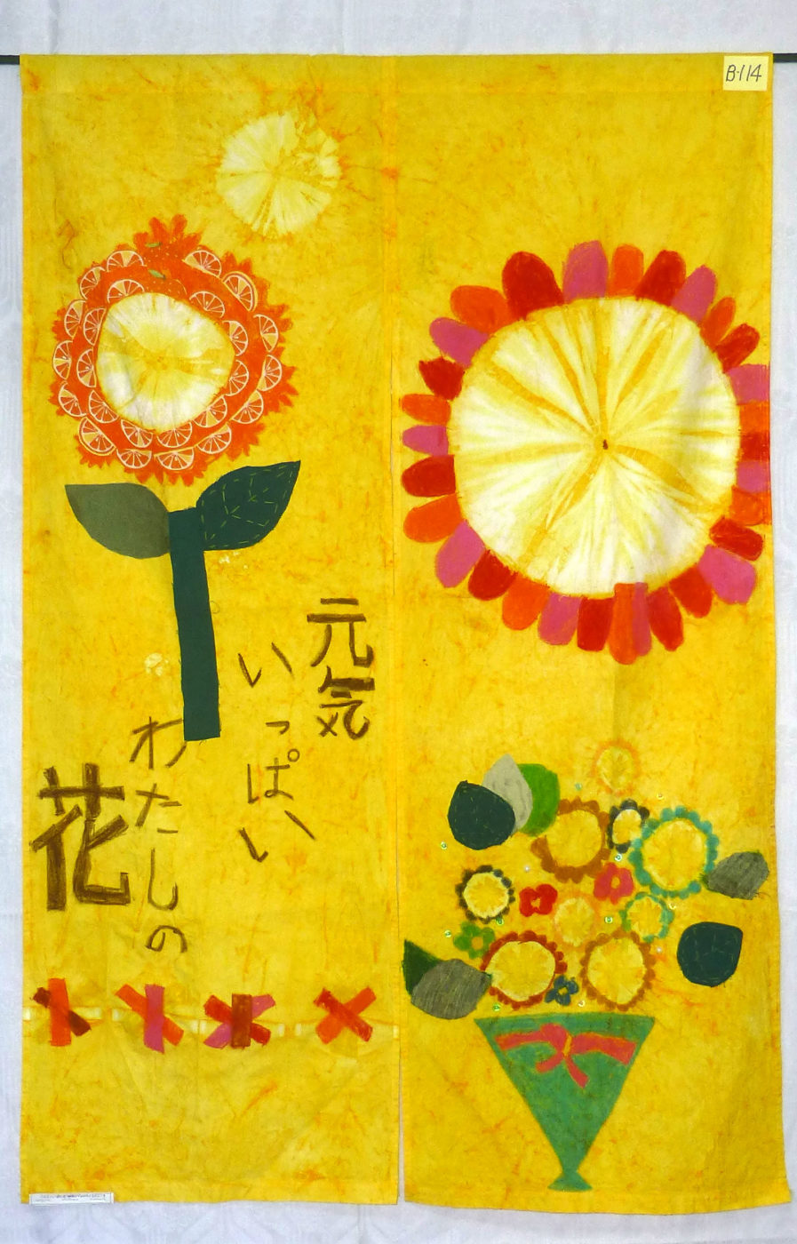 見たら元気が出るようにあかるい色をつかいました。大きい花を、書いてはくりょくを出しました。